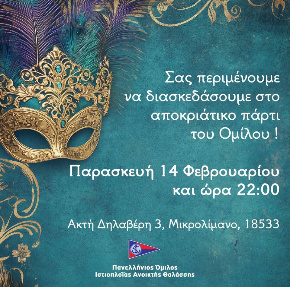 Σας περιμένουμε να διασκεδάσουμε στο Αποκριάτικο Πάρτυ του Ομίλου! Παρασκευή 14 Φεβρουαρίου 2025 και ώρα 22:00